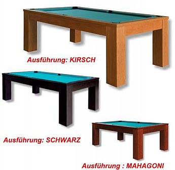 Durch die etwas zur Mitte versetzte Unterbaublende entsteht eine ideale Beinfreiheit von ca. 72 cm. Mit dem Kauf der optional angebotenen passenden 2-teiligen Massivholz- Abdeckplatte verwandeln Sie im Handumdrehen ihren Billardtisch in einen nützlichen Ess- oder Konferenztisch.