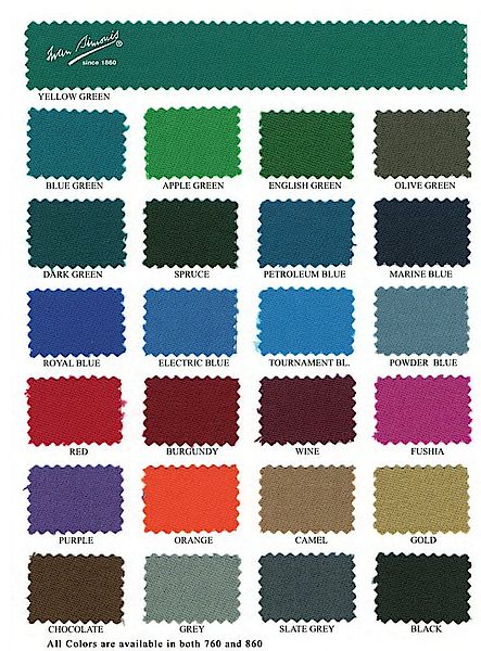 Die Firma Simonis bietet darüberhinaus eine große Angebotspalette von vielen Farbvarianten um jeder Billardtischumgebung nicht nur vom Material sondern auch vom Farbton zu gefallen.